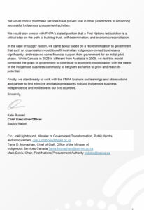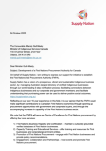 Supply Nation, Australia’s leading Indigenous procurement intermediary, has provided a letter of support that highlights the global credibility of Indigenous-led procurement authorities and reinforces the importance of First Nations–designed and led solutions. Their endorsement affirms the opportunity for Canada to establish a First Nations–led Procurement Authority grounded in international experience and proven impact.